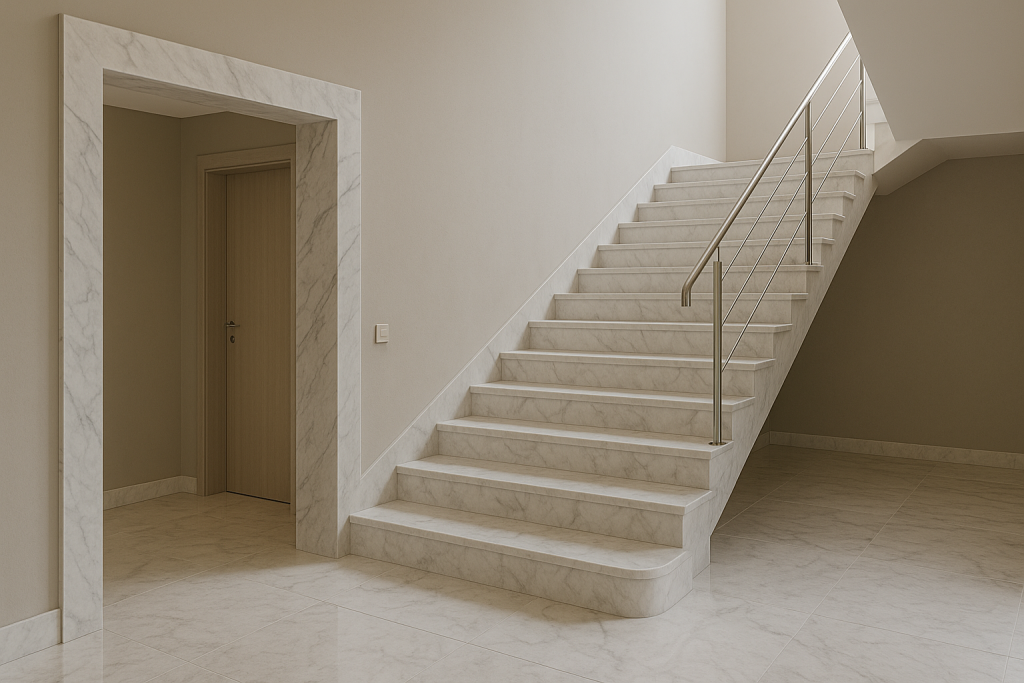 Diseñamos escaleras (huella y tabica) y pavimentos en mármol con zanco/zanquín a juego. Elegimos el acabado idóneo para cada uso: pulido en interiores, apomazado/antideslizante en zonas de paso o exterior. Resultado atemporal y elegante.